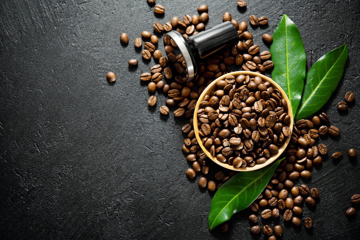 Coffee beans with tamper and leaves on dark background. Coffee concept. Coffee background. Flat Lay.